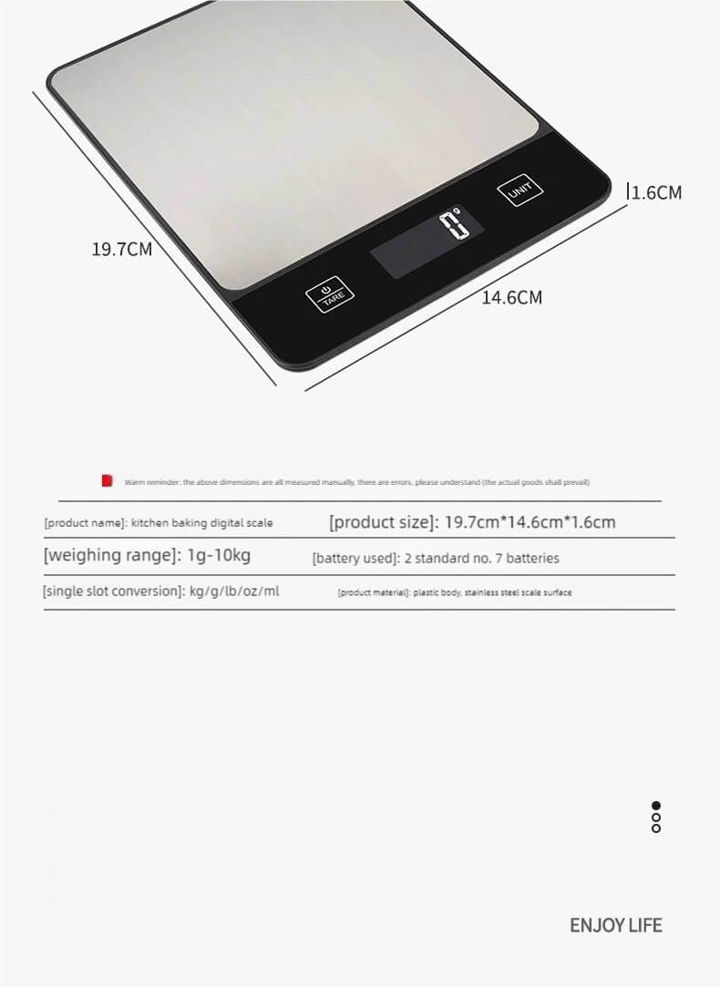 This scale is a game-changer for my meal preps! Super accurate, even when I'm weighing coffee beans at 6 a.m. before work. Love that it goes up to 10kg—handled my giant pumpkin pie batter like a boss. Sleek design fits perfectly on my tiny kitchen counter. Worth every penny for us precision-obsessed adults.