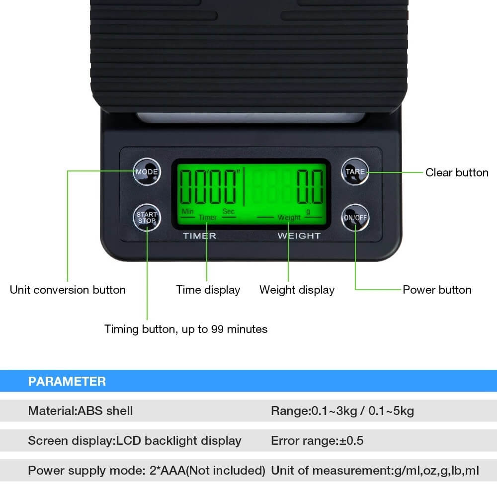 I've been looking for a reliable digital scale for my coffee brewing, and this one hits the spot. Accurate measurements up to 5kg, tare function works smoothly, and the build feels solid. Plus, it arrived two days earlier than expected! The team responded promptly to my email and was very courteous. Highly recommend both the product and the service.